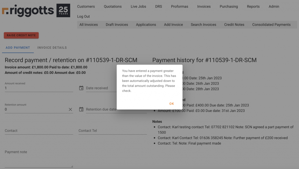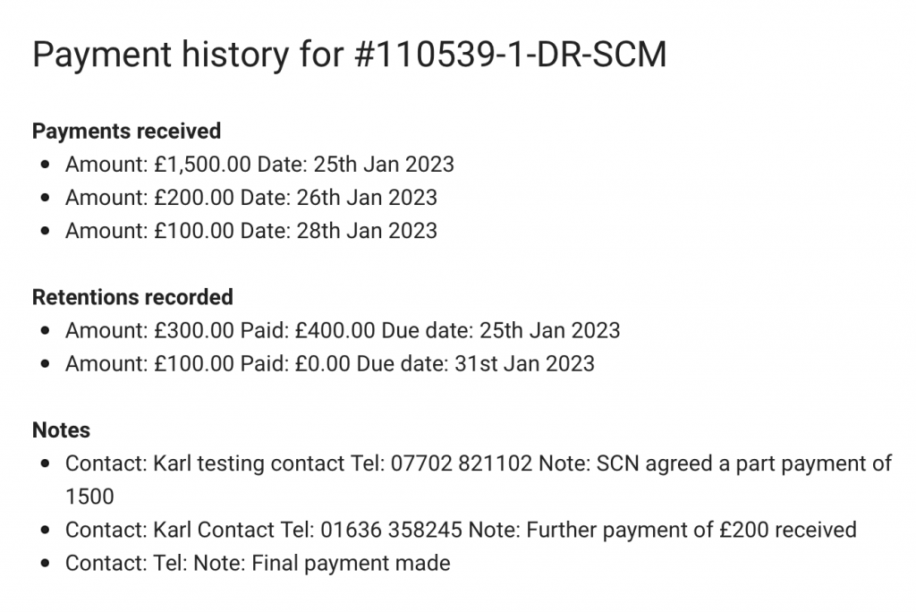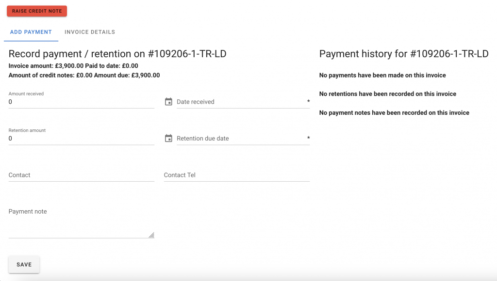 - In the payment screen, you can see the history for the invoice, if any – i.e. Payments made, retentions added and any payment notes. You can add a new payment, a new retention or a new note. Or all three at once.