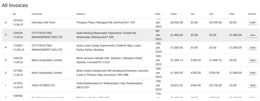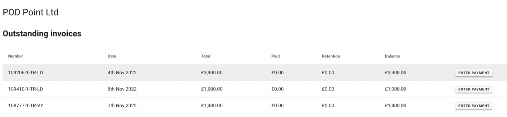 The current invoices value, VAT amount, outstanding value, and paid values with a link to view the invoice and payment details can be seen on the invoices dashboard.