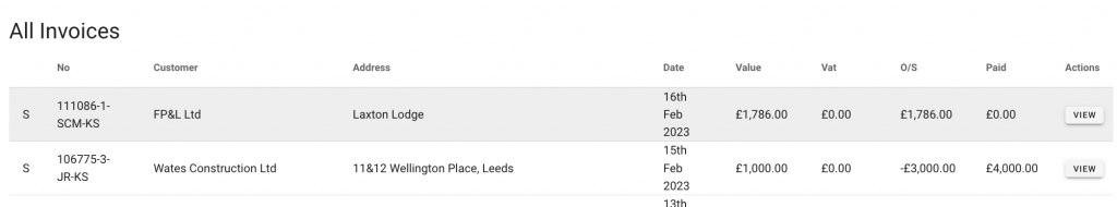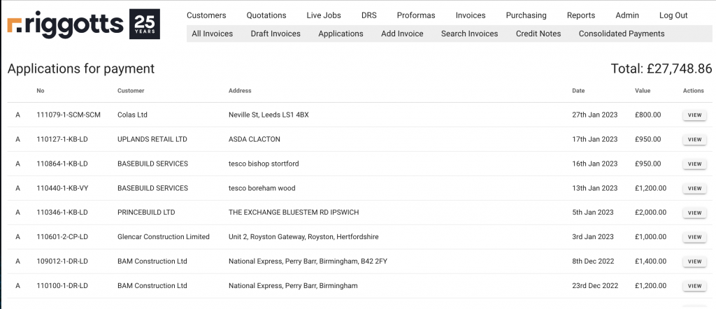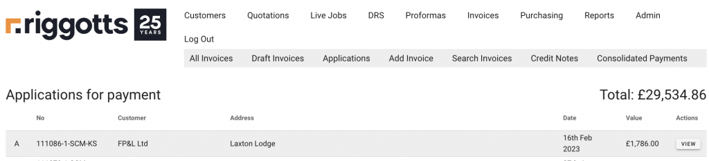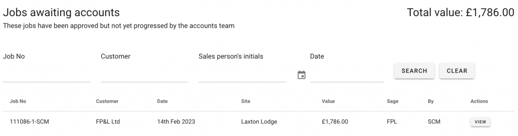 From the ‘Awaiting Accounts’ Menu – i.e. the job is complete and can be progressed to invoice or application, click the job ‘View’ button on the right-hand side.