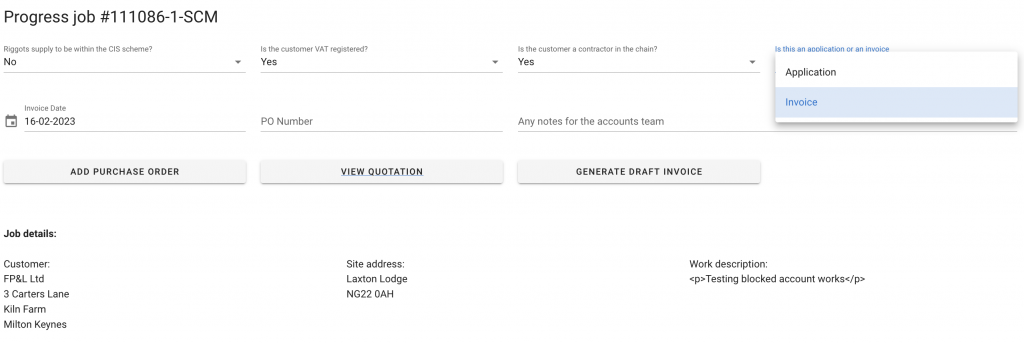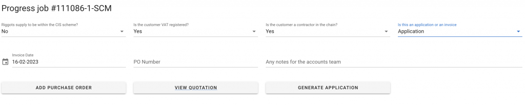 If the job information is correct, when you click ‘Progress’, you will be taken to the job progress page where you can select Application or invoice from the right-hand selection.