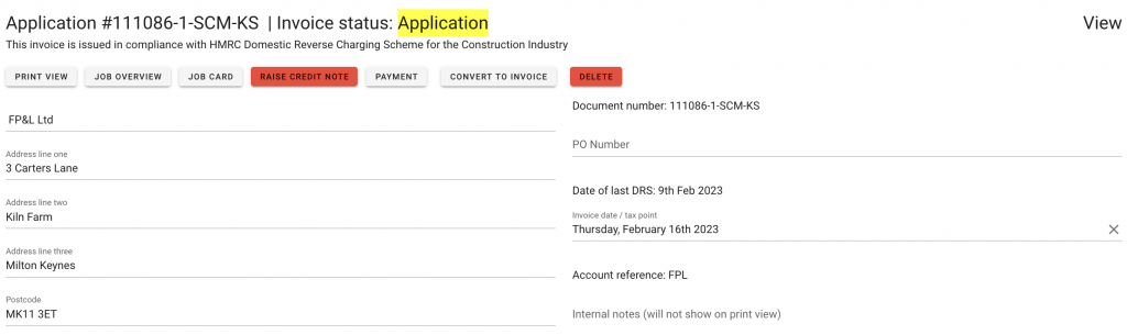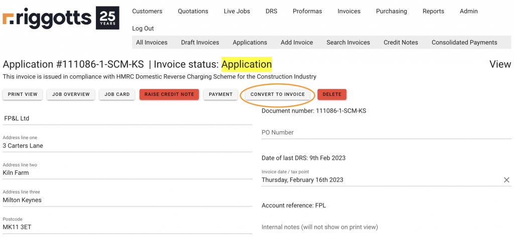 Upon the customer confirming the application, you can convert this to an invoice by clicking ‘Convert To invoice.’