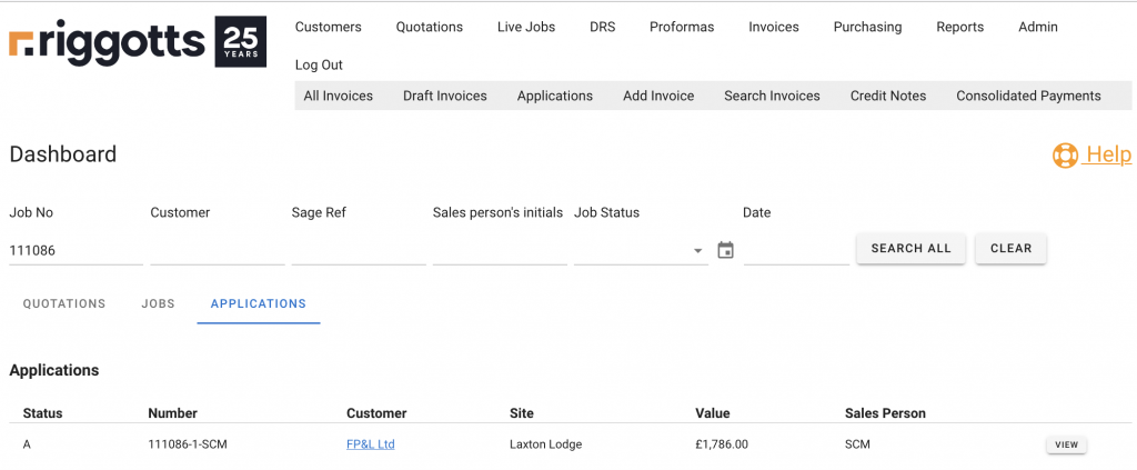 Using the Main Dashboard Search facility, by clicking the Riggott Logo, you can search the specific job and Quotations, jobs, and Applications associated with that job will be shown. and the status will be shown as an ‘A’ for the Application.