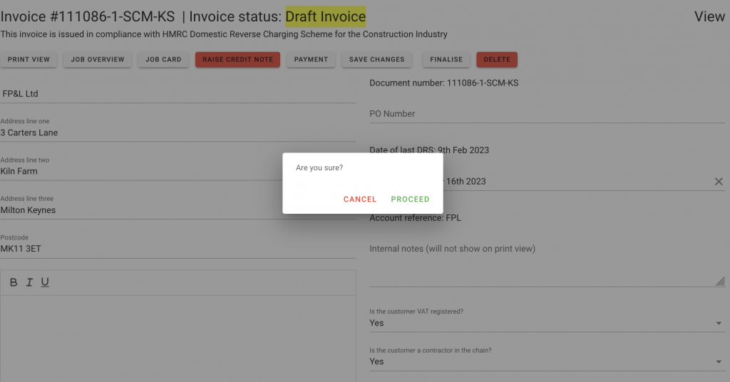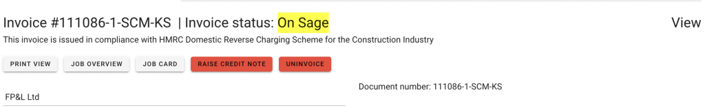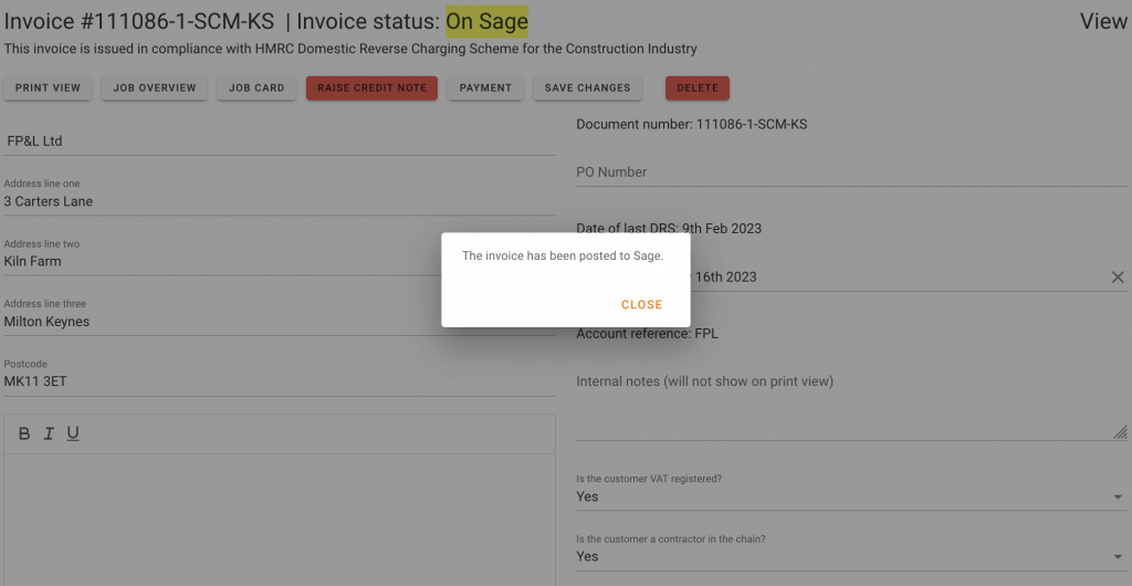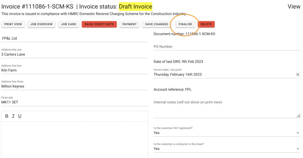 When the ‘Convert To Invoice’ button is clicked, the status changes to ‘Draft invoice’, and the ‘Finalise’ button appears to finalise and send to Sage.