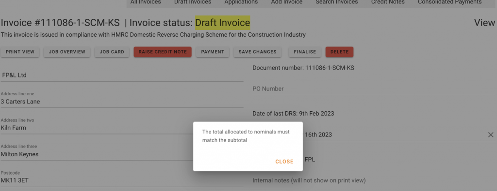 You will see this message if you click ‘Finalise’ before allocating the job nominals.